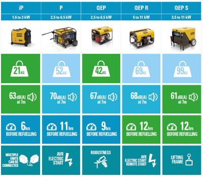 IP 发电机功率范围为 1.6 至 3 kW;P 系列功率范围为 2.5 至 6.5 kW;QEP 功率范围为 2.5 至 6.5 kW;QEPR 功率范围为 5 至 11 kW;QEPS 功率范围为 3.5 至 11 kW。